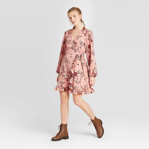Women S Floral Print Long Sleeve V Neck Wrap Mini Dress
