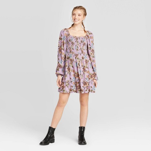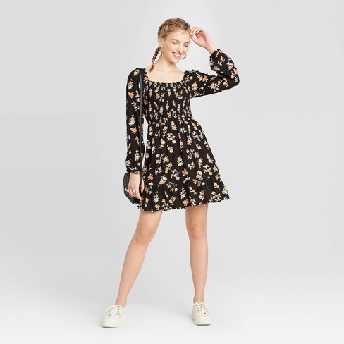 Women S Floral Print Long Sleeve Square Neck Smocked Top Mini