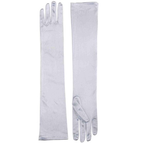 These stylish long white gloves are elbow length at 22in and feature a comfortable stretch design that fits most standard womens sizes. Jisen women fingerless gathered lace sequins satin bridal party gloves. Gloves are 100 nylon.