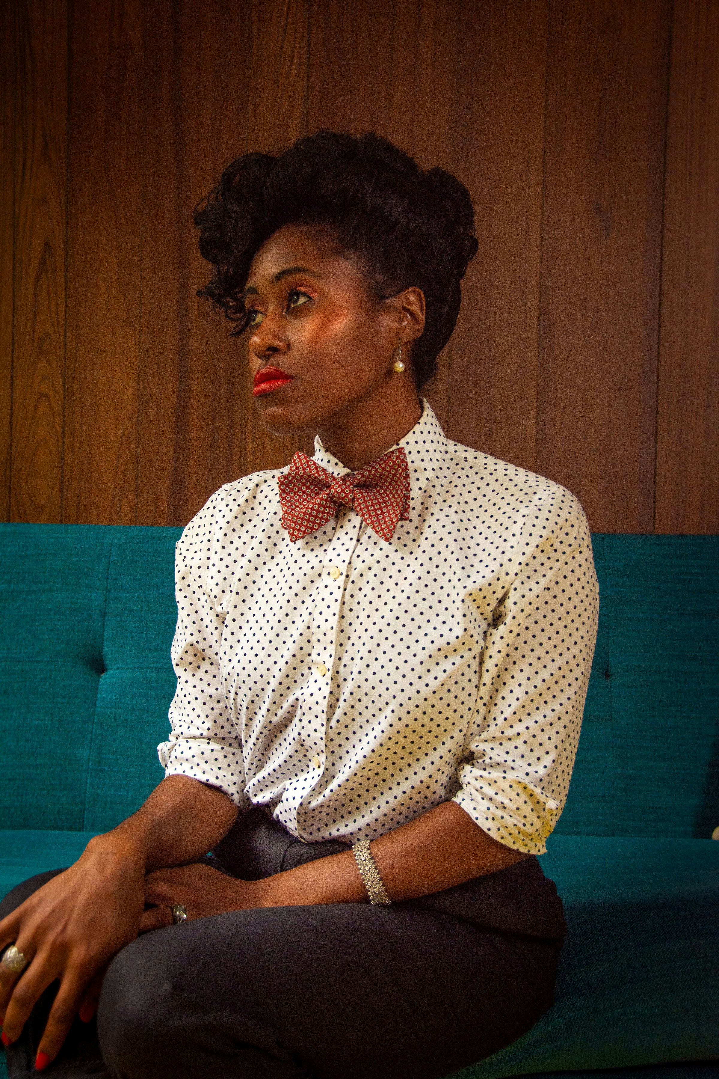 Woman Wearing White Dress Shirt Red Bow Tie And Black Pants