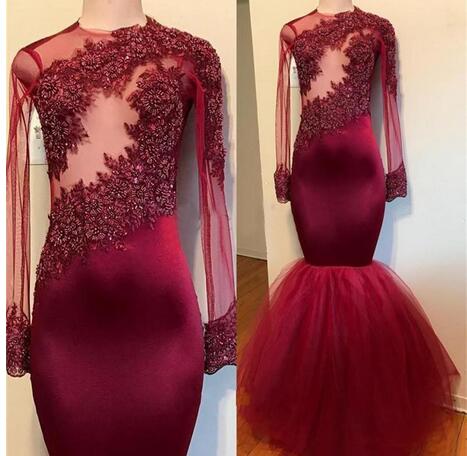 Gorgeous Beaded Burgundy Long Sleeve Prom Dresses Illusion Elastic