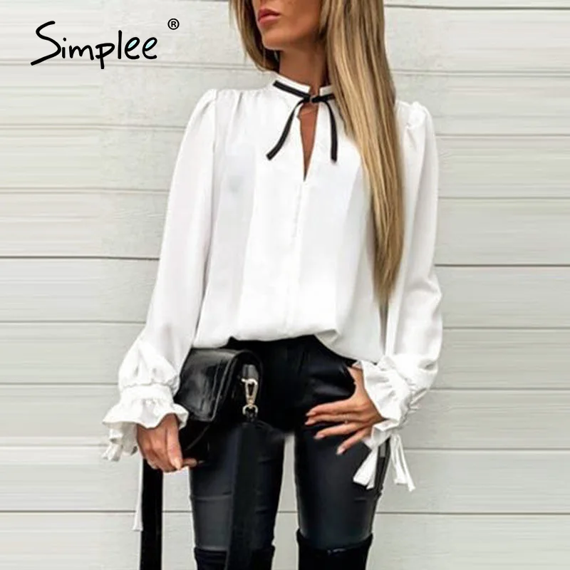 Simplee Sexy Solid Casual Women Blouse Shirt Long Sleeve White