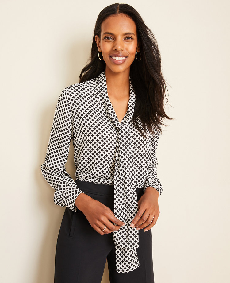 Geo Windowpane Tie Neck Blouse
