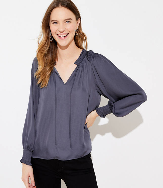 Shirred Ruffle Tie Neck Blouse