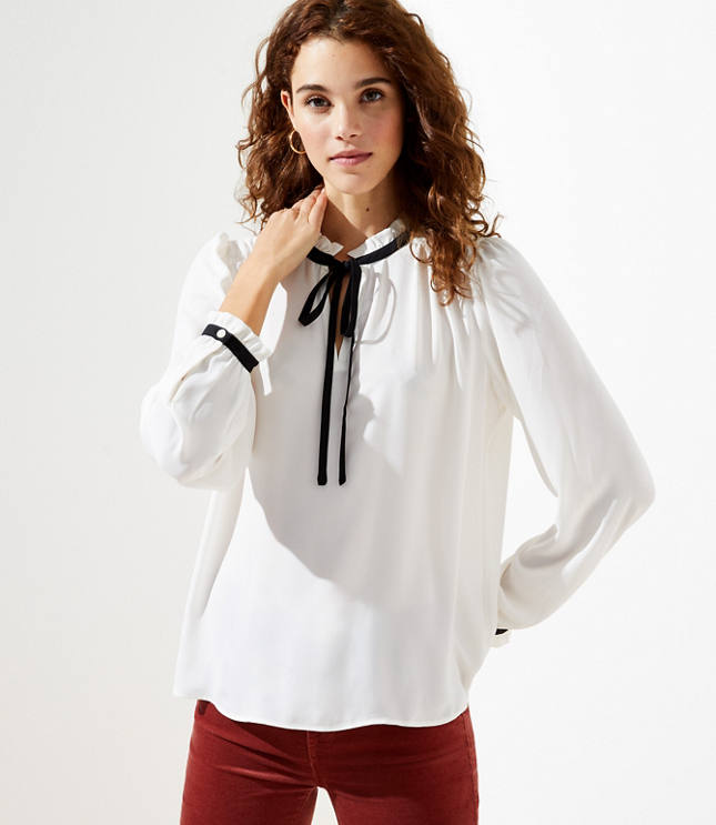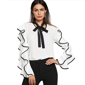 Oem Women Tie Neck Contrast Binding Ruffle Long Sleeve Blouse