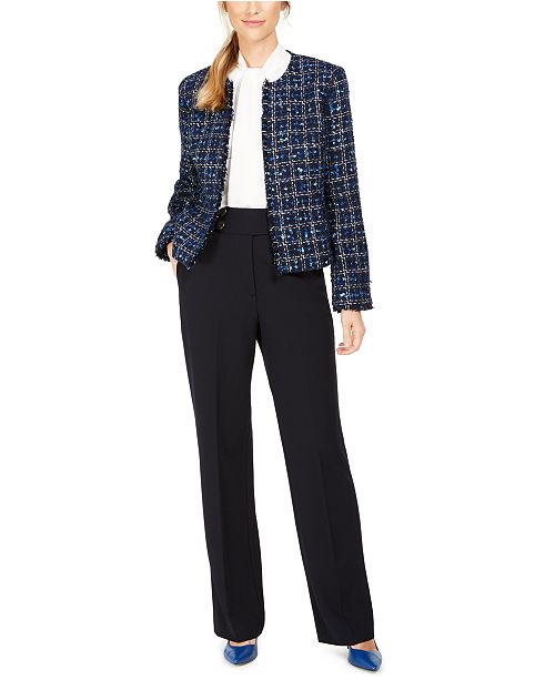 Calvin Klein Tweed Blazer Tie Neck Blouse Button Waist Pants