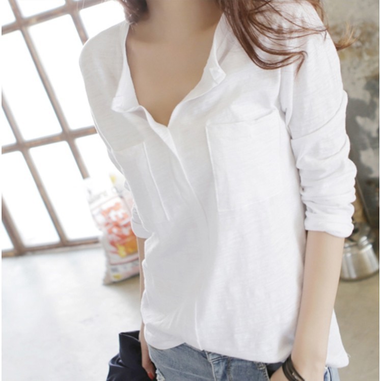 Korean White V Neck Long Sleeved T Shirt Female Simple Loose Shirt